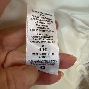 Women’s white faux fur lined sleeveless vest By Time & Tru. Size Medium (8-10) NWOT Ideal for layering. Faux fur 68% acrylic 20% poly 12% modacrylic Lining 100% poly Spot clean only. P2P 18.5 length 25 SFPF HOME