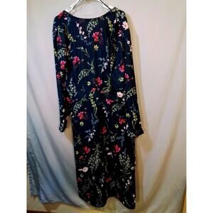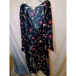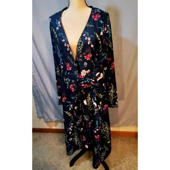 Time and Tru Faux Wrap Dress: Navy blue with flower design of red and pink with a bit of green and yellow on the vines. Hook closer at center with side tie and pipping along cuff. This robe give off a sense glamor to relax around the house. Size: XXL