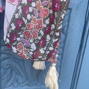 Charming kimono with floral design. Features pink and purple flowers. Delicate lace accents.