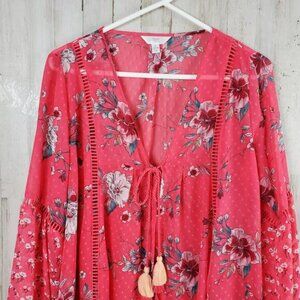 Time and Tru Floral Open Front Top with Balloon Sleeves Pink.