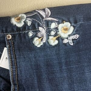 Time and Tru Girlfriend Cuffed Ankle Jeans with Whiskering and Fading and Embroidered Flowers on Both Sides.