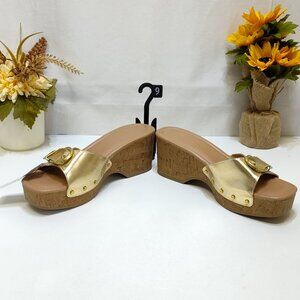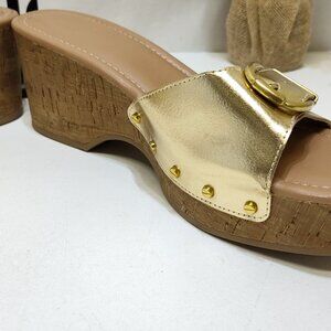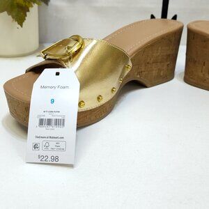 Time and Tru Gold Buckle Cork Wedge Platform Memory Foam Sandals Size 9 NWT