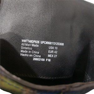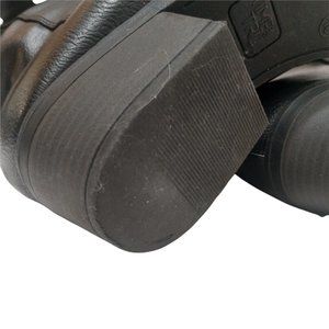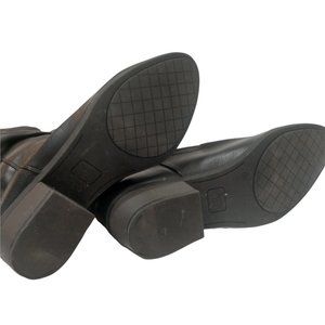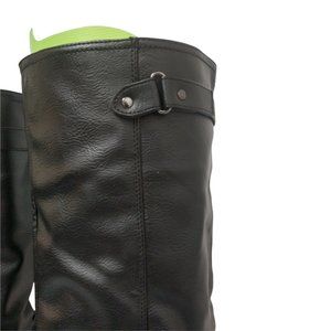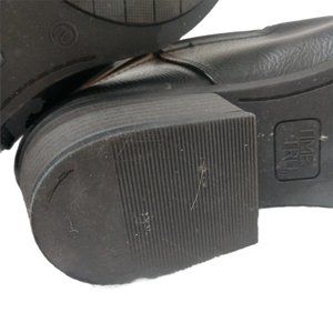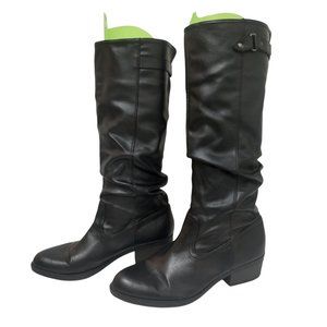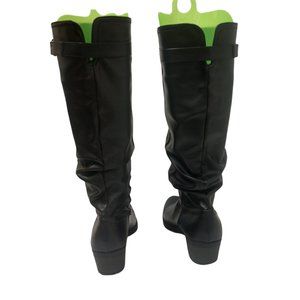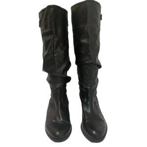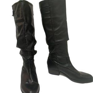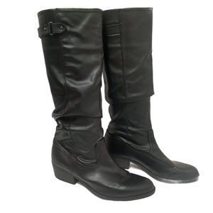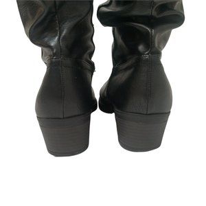 These pair of boots from Time and Tru in solid black, style number WMTT48DP026, has leather fabric, block heels, almond toe, and slouchy shaft with a strap detail around the collar.