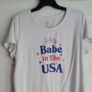 White t-shirt with 'Babe in The USA' graphic in red and blue.