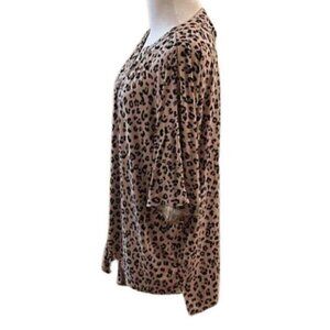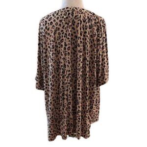 Time and Tru maternity top with a bib neckline in a black and tan leopard print. Stretchy fabric provides a comfortable fit throughout pregnancy. Features 3/4 sleeves and adjustable drawstrings at the front hem. Machine washable.