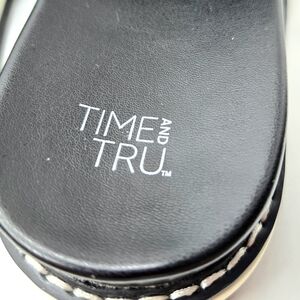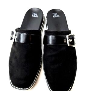 Time and Tru flat mules. Very sharp-looking shoes in a cool suede-looking black upper with a silver buckle accent, and white soles. Size 6M.