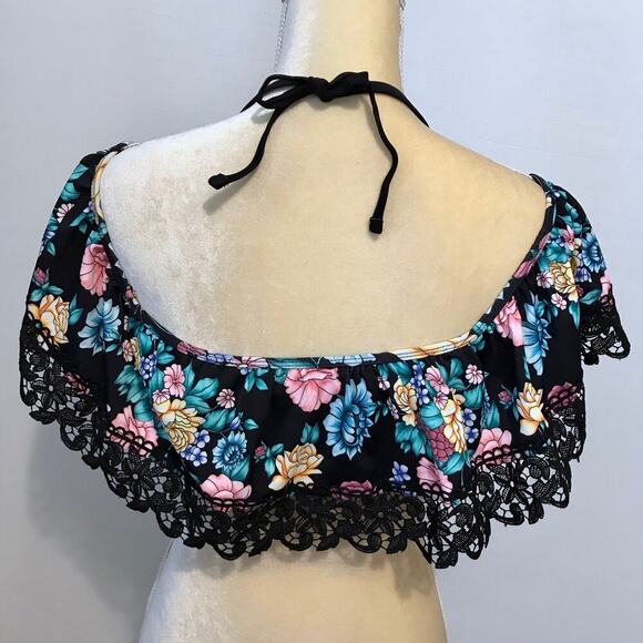 NWT. Convertible Swim Top for Women Size 8-10 (D/DD). Black with multicolor floral pattern throughout, can be worn on or off shoulders, halter style, "crochet" trim overlay internal bralette, removable padding and strap, Pictures are part of description.