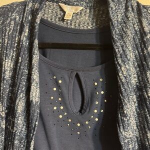 Elegant navy cardigan with matching top. Features a unique pattern and stylish design.