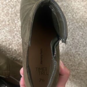 Stylish olive ankle boots. Side zipper detail. Comfortable block heel.