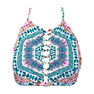 Eye-catching halter bikini top featuring a vibrant geometric print. This stylish swim top boasts a unique criss-cross front detail with gold accents, offering both a fashionable look and comfortable support. The adjustable halter neck and back tie ensure a perfect fit, while the colorful pattern adds a playful touch. Perfect for lounging by the pool, beach vacations, or summer festivals.