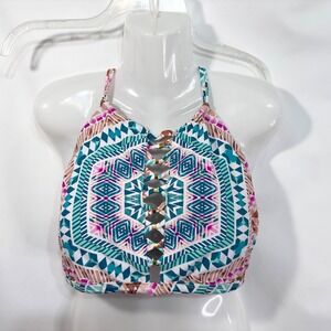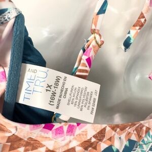 Keywords: halter bikini top, criss cross, geometric print, swimsuit, swimwear, plus size, 1X, Time and Tru, beachwear, pool party, vacation, adjustable, colorful, bohemian