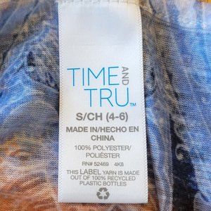 This Time and Tru beautifully patterned multicolored shirt is S/CH (4-6). It is light weight and has sparkles. It has been lightly used. It is polyester.