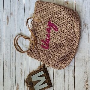 Time and Tru Tan Woven Tote with "Vacay" in Purple