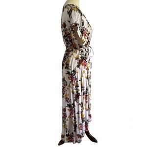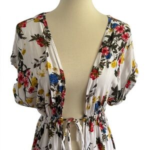 Time and Tru White Multicolor Floral Short Sleeve Tie Hi Low Hem Duster Size M