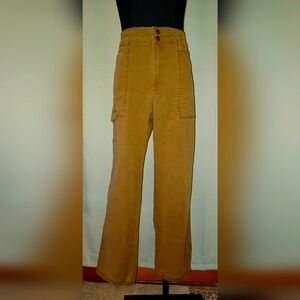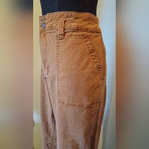 cinnamon spice brown relaxed, slim fitting leg and high rise waist lend comfort and style to these classic cargo pants. plenty of roomy pockets. see pictures. they are part of the description. leg shape that is comfy and flattering. easy to move in.