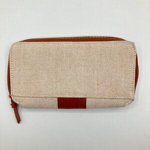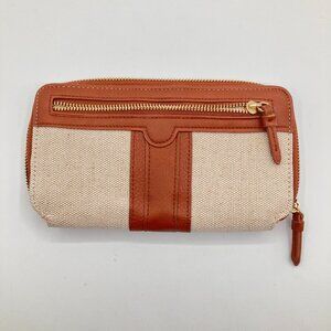 Time and Tru Womens Freda Large Zip Around Wallet Leather Linen Beige Brown