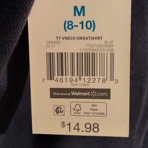 Women's V-Neck Sweatshirt from Time and Tru Material: 100% Cotton Care: Machine washable Fit: Relaxed Neckline: V-neck Closure: Pullover style Sleeves: Long balloon sleeves with fitted cuffs Pockets: None Features: Super-soft feel Color:Dark Iris Size: M (8-10)