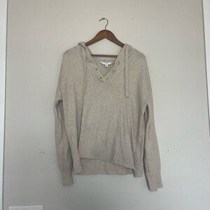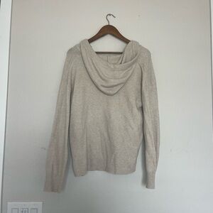 Cozy tan sweater with a hood. Features button details. Perfect for casual wear.