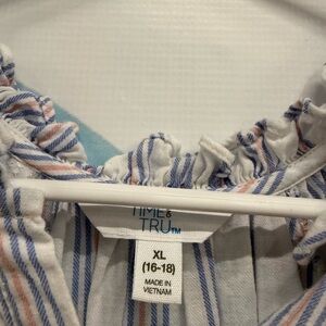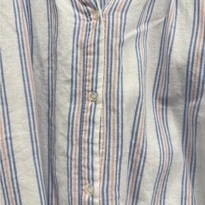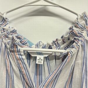 Women’s top with ruffle sleeves, white blue, and pink, size XL