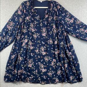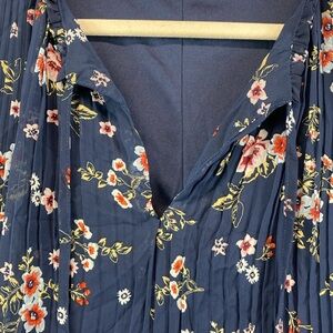 Floral print on navy blue. V-neck with ties. Loose fit. Flowing fabric. Loose, puffy sleeves. Fully lined. Pleating on front and back for extra volume.