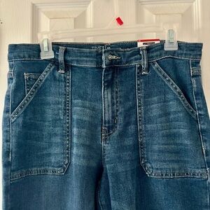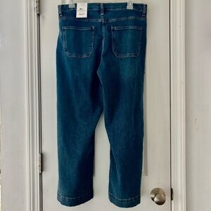 Classic wide leg /high waist jeans. New with tags. Front patch pockets. Never worn! Size 10 womens. Please read carefully: These do NOT fit like a size 10, but more like a womens size 6-8. Purchased for myself, but they are too short! Missed my return window. I am 5’2”. These would be great for someone about 5’ft tall or shorter. Inseam is 24”( From crotch to bottom of leg). Waist is 16” across from one side of waistband to another. Indigo blue.