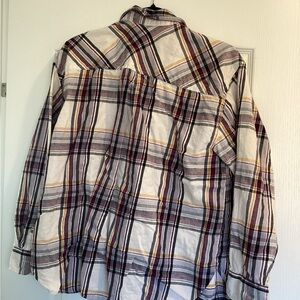 Casual button-down shirt with plaid design by Time and Tru. Features white, purple, and yellow colors. Ideal for everyday wear. Size extra large excellent preowned condition. Smoke free home.