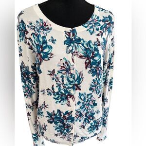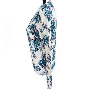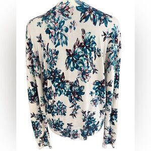 Time and Tru button front floral cardigan size M (8-10). Lightweight, rayon and polyester blend. Ivory background with blue, pink, and burgundy flowers. Approximate measurements are pit to pit 20”, length from shoulder approximately 25”.