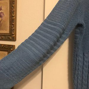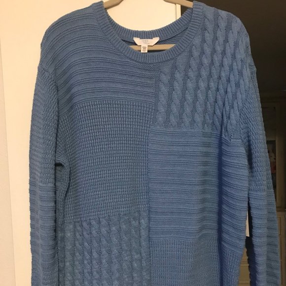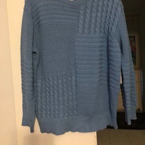 Time and True 3X (or 22) beautiful medium blue sweater. Multiple knit styles. Long sleeves. Not tunic length but generous. New condition, never worn. See fabric tag pictured and label pictured.