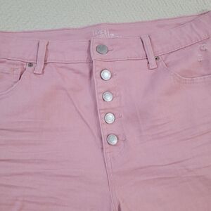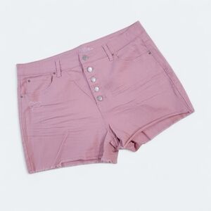 Pink denim high rise shorts. Cut off hems with distressing. Button fly. 5 pocket design.