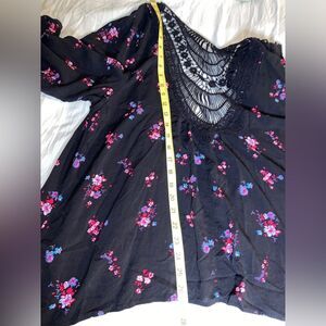 Black with small bright pink floral pattern. Cute boho lace back. Hits right at waist. Time and tru one size cover up. Black floral kimono