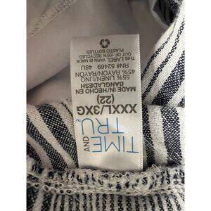 Time and True Linen Capris High-rise, relaxed fit, pinstripe capris in XXXL. Made of 55% linen and 45% rayon. Features an elastic waist, front slash pockets, baggy-oversized high rise, for a relax fit. Machine washable. Made in Bangladesh.