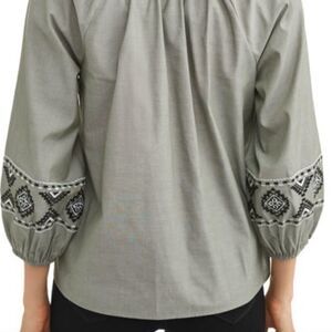 Beautiful and boho-inspired. Notice the detailed embroidery at the button placket and blouson sleeves of this classic Peasant Top from Tine and Tru. 100% Rayon