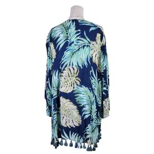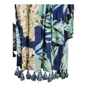 Time for Me Tropical Leaf Kimono Tassel Cover Up 2X Navy Green Viscose