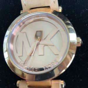 Michael Kors Rosegold and tan leather band watch new without tags new battery it works great there’s just one little scratch in the back where I change the battery it’s absolutely spectacular it’s time to stay in