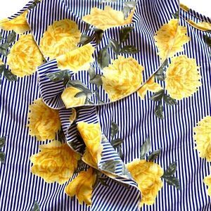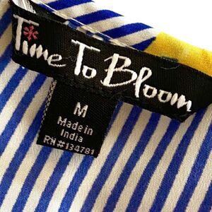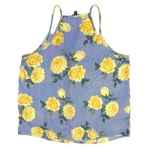 Brighten up your wardrobe with this charming halter top from Time To Bloom. Featuring a playful mix of bold yellow floral patterns over classic blue and white stripes, this top exudes a fresh, summery vibe. The lightweight fabric and relaxed fit make it perfect for warm-weather outings, while the halter neck style adds a flattering touch. With a ruffled front detail for a hint of femininity, this size Medium top pairs effortlessly with jeans, shorts, or skirts for a vibrant, casual look. In excellent pre-loved condition, ready to add a pop of color to your collection.
