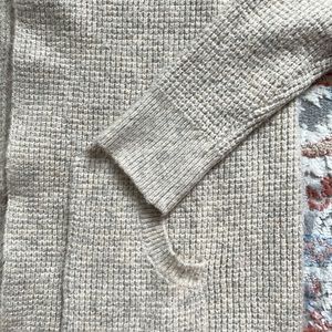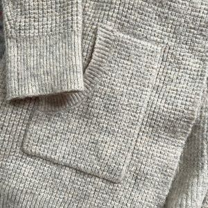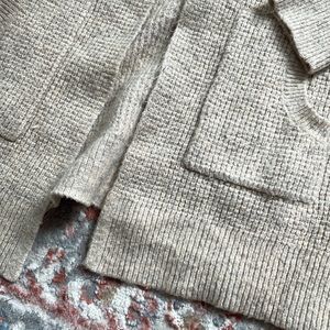 Long cozy sweater of khaki gray gently worn made tweed 66% acrylic, 32 polyester,2% spandex