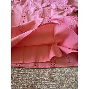 Time and Tru women’s button front blouse in coral color featuring allover eyelet lace design with ruffle neckline and long sleeves with elastic cuffs. Includes matching lining for coverage. Shell 100% cotton, lining 80% polyester 20% cotton. Made in China. Machine washable. Women’s size M (8-10). Color coral. Excellent condition new with tags. Please refer to photos