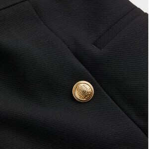 Short, fitted skirt in woven fabric. Covered elastic at waistband, a concealed zipper at back, and mock welt pockets. Decorative buttons at front with a slit.