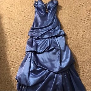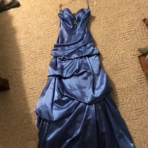 A beautiful blue satin dress with silver and blue jewels. It’s a floor length dress with ruffles. Worn once for 2 hours. Great condition!