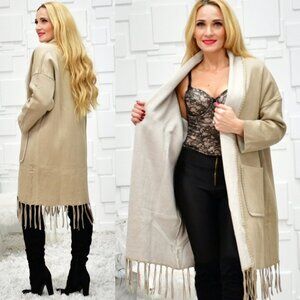 Timeless cardigan featuring 2 tone color combo, pockets, fringe detailing an over semi-oversized fit. This will be a forever staple.