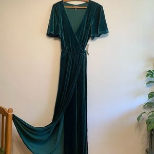 Gorgeous emerald velvet maxi dress, Size Medium. Wrap dress with adjustable tie-belt at waist. Unlined, fabric provides stretch. Hand wash only.