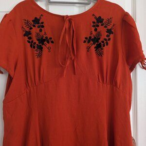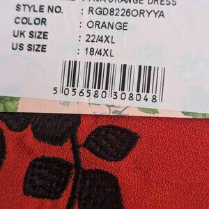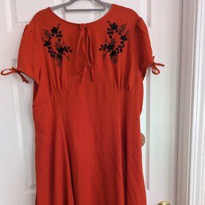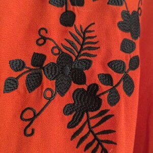 This dress has black embroidered flowers on burnt orange. The dress is new with tags. It is a 1940s vintage cut.