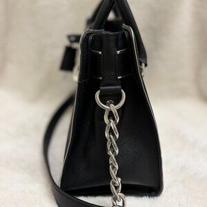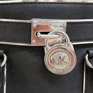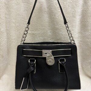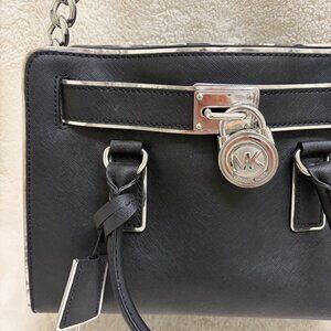 Classic Michael Kors Hamilton Tote, in black Saffiano Leather. Beautiful black tote with silver trim and accents. Cool padlock silver charm, key charm, belted look on front. Double back handles, with a shoulder strap made from chunky silver chain and leather. Snap closure with inside zipper pocket. Inside lined with logo fabric, black. This is a classic structured tote ideal for students, travel, professionals, moms you name it. Very roomy and stylish.