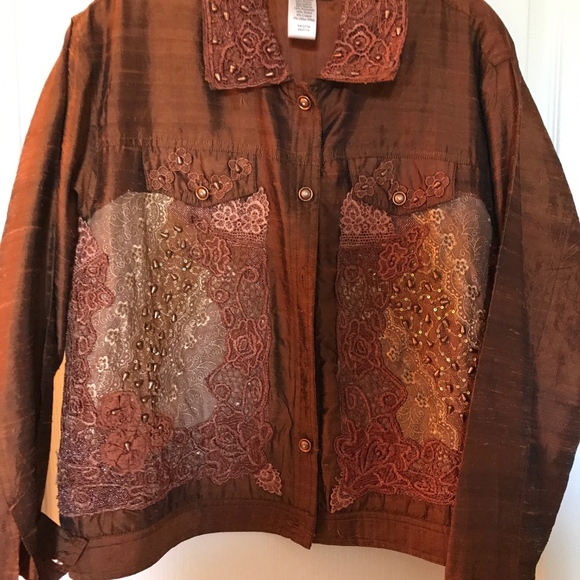 Bronze colored jacket with beadwork around collar and front and back of jacket. NEVER BEEN WORN.