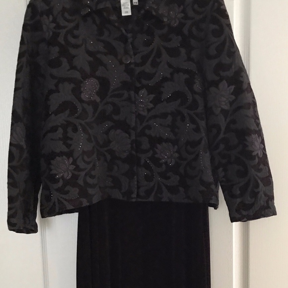 This item is a two piece dress and jacket. The color is a deep purple/grape. The dress is spandex and the jacket is a brocade.