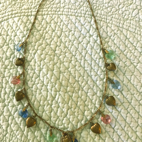 A nostalgic necklace made out of colorful pieces of metal and glass