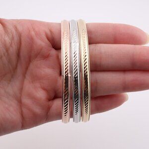 The set includes three bangle bracelets: silver, gold, and rose gold, each with its own unique design and character. Whether worn individually for a subtle accent or stacked together for a bold statement, these bracelets offer endless styling possibilities to suit any occasion.