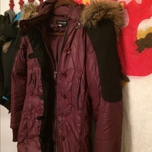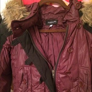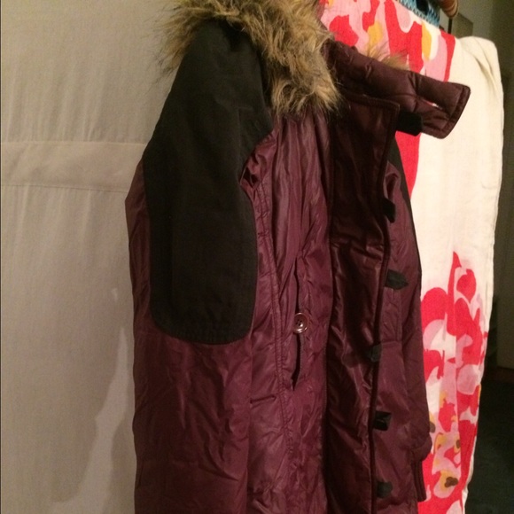 Knee length coat with a hood, motorcycle patches at elbows higher pockets. In a beautiful wine color fitted.