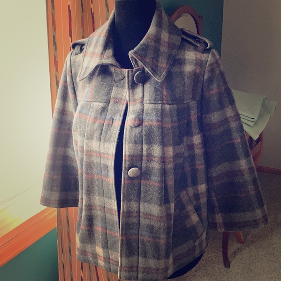Short, slightly flared wool (80% wool, 20% nylon) with three-quarter length sleeves. Soft plaid. Three covered buttons. Pockets. Functional epaulets. Fully lined.