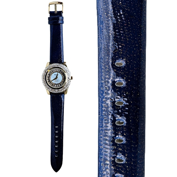 Stunning Gold Timepiece with Shimmering, Gold dusted, Dark Blue Genuine Leather Band.